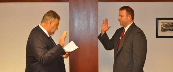 | IAM General Vice President Bob Martinez, left, swears in Randy Erwin as NFFE/IAM National Secretary-Treasurer. |