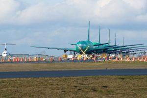 EVERETT, WASHINGTON, USA – JAN 26th, 2017: Brand new Boeing 787 Dreamliner with no engines and paintinnnng waiting to be completed and for a successful test flight at Snohomish County Airport or Paine Field. An old Boeing 727 in the background.