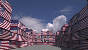 Containers with MADE IN USA text and national flags. American import or export related 3D rendering